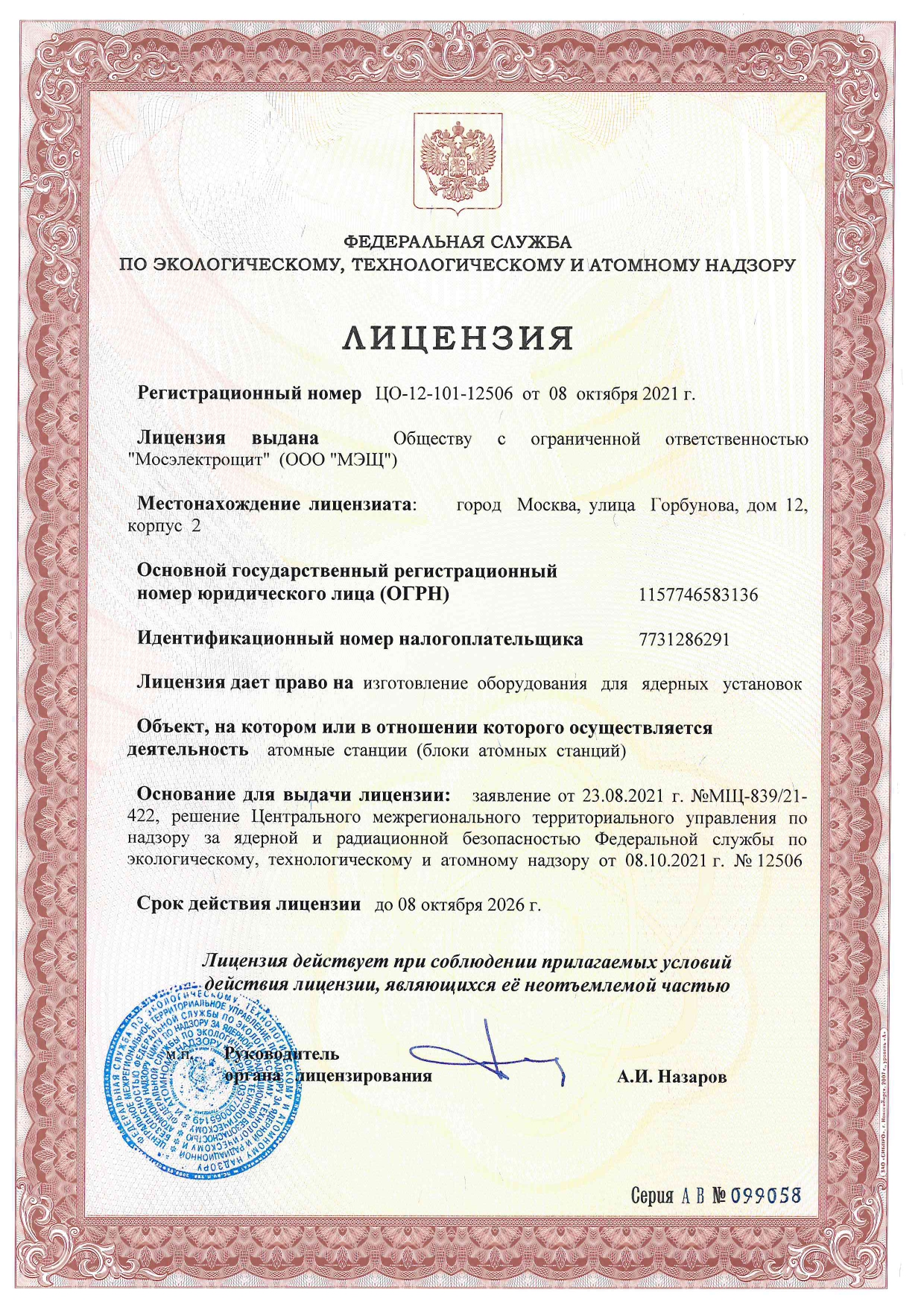 Осенью мы получили лицензию на право конструирования и изготовления оборудования для ядерной установки. Соответствующее разрешение было выдано Федеральной службой по экологическому, технологическому и атомному надзору. Срок действия лицензии - до 08 октября 2026 года и распространяется на следующие виды оборудования: